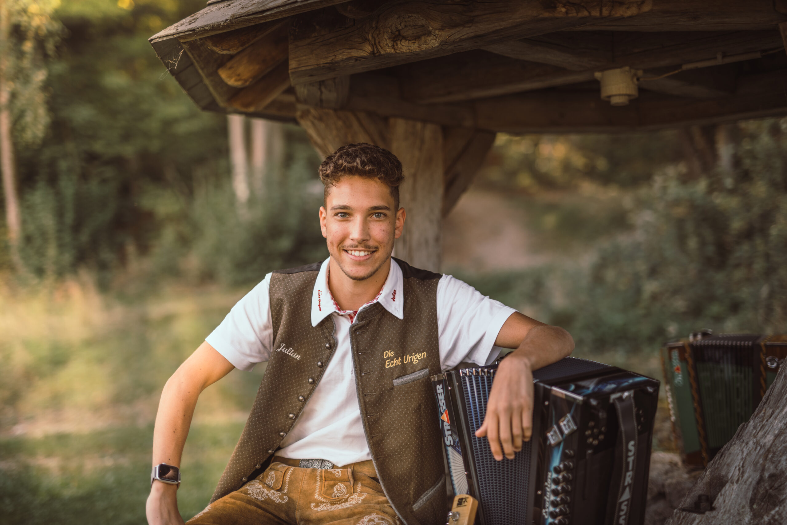 Julian ist der jüngste im Bunde. Er ist dreifacher österreichischer Staatsmeister und besitzt das Goldene Leistungsabzeichen auf der steirischen Harmonika. Julian ist Lead-Sänger der Band und spielt natürlich Steirische und E-Bass.